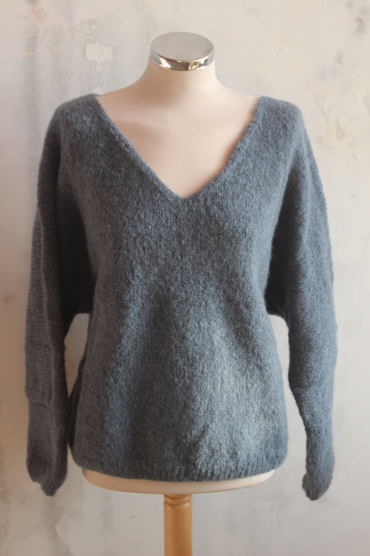 Pure wool soft French blue hand knitted v neck oversized jumper