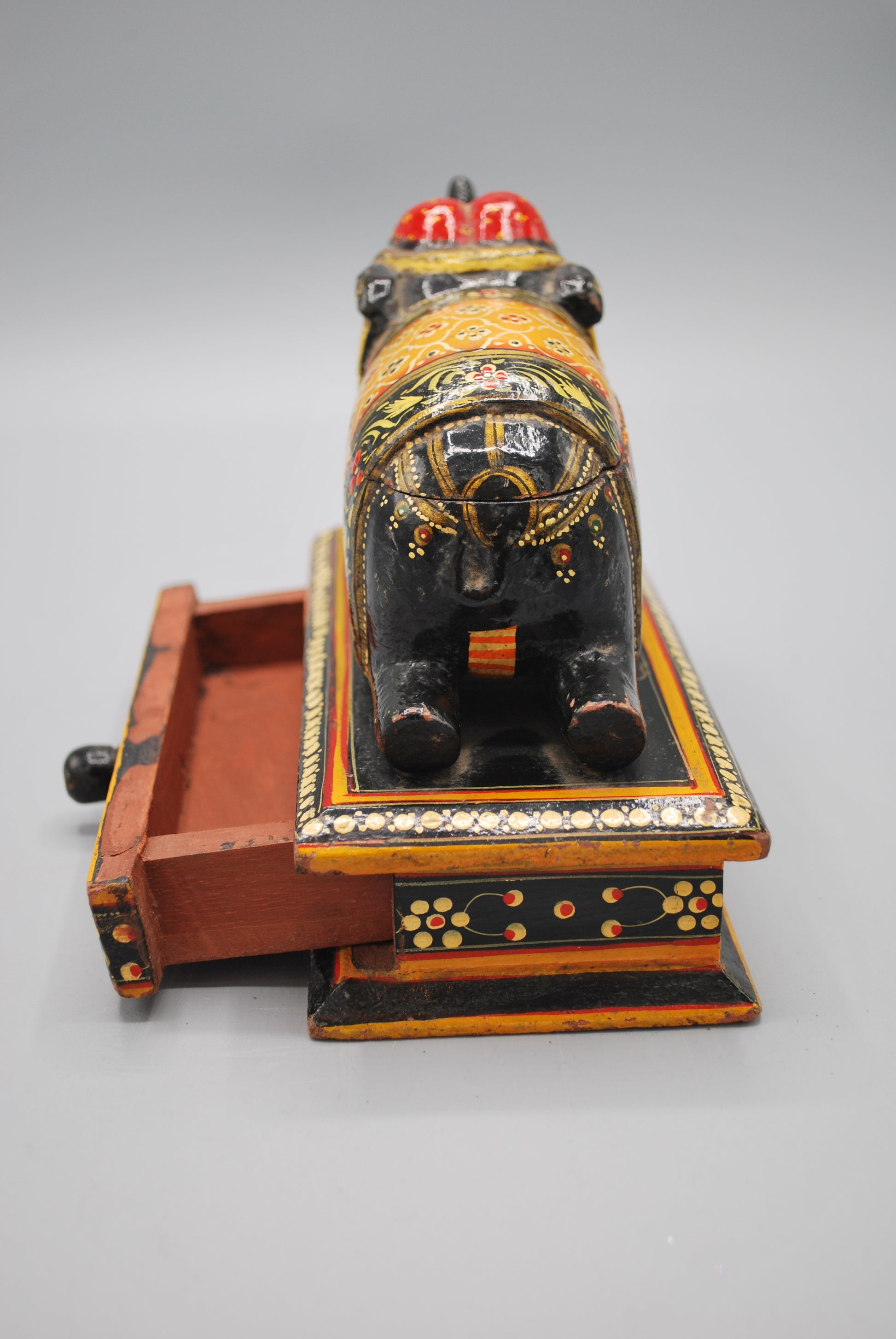 Little drawer at the base and a swivel secret stash in elephant’s body.