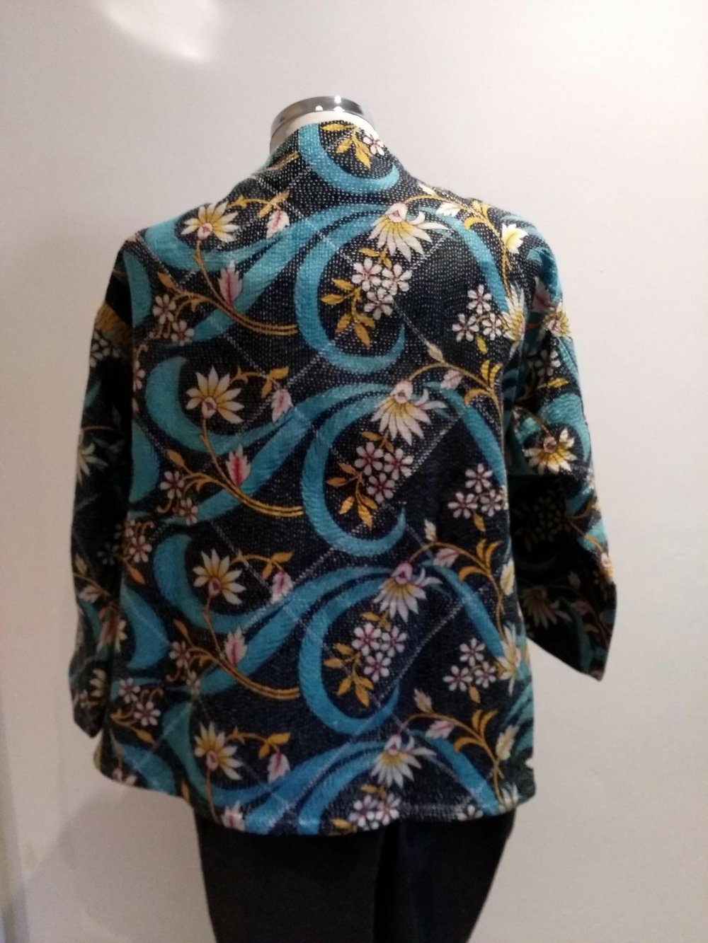 Jaadu Boutique's kantha stitch jackets are made from pure cotton vintage sari offcuts. Recycling fabric is a sure way to ensure a circular supply chain within the fashion industry, and makes each piece a unique one-off.