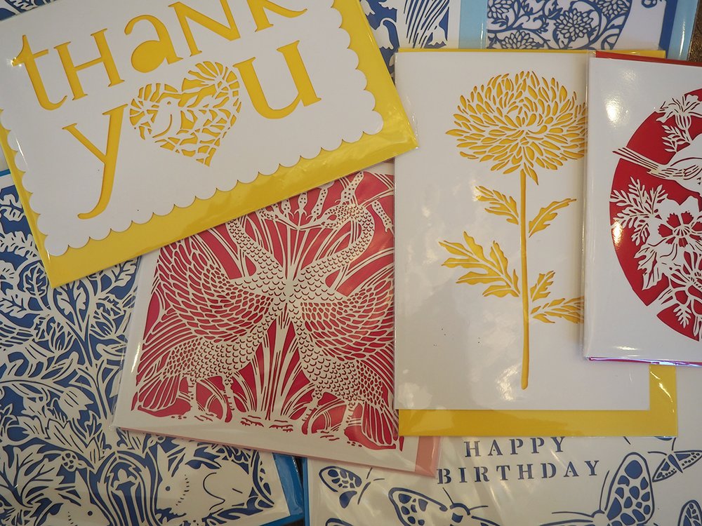 Paper cut designs on colour block background. Blank inside. Made in England.