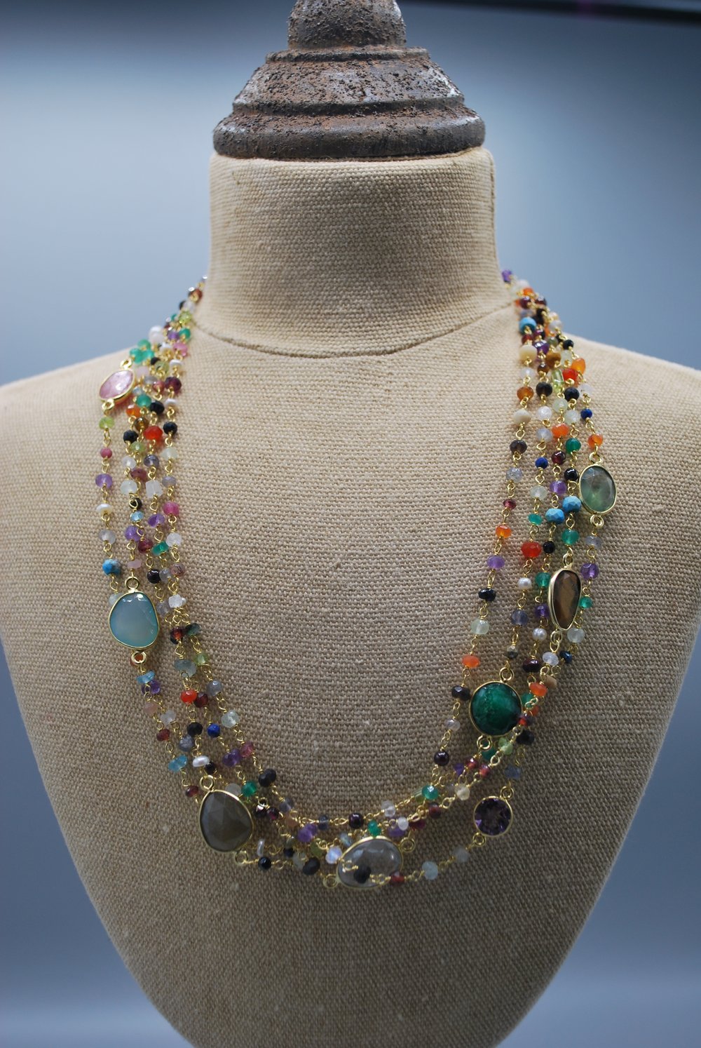 Seed pearl, amethyst, carnelian, peridot, garnet, aquamarine, smokey quarts, moonstone and others.